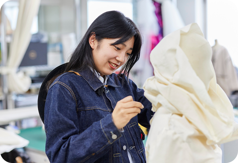 将来はデザイナーとして、デザインから仕立てまでをこなせるようになり、アパレル業界で経験を積みながら独立を目指します。休日はリフレッシュを大切にし、カフェや図書館で課題に取り組むことも。学びと実践を重ねながら、一生ものの技術を身につけています。