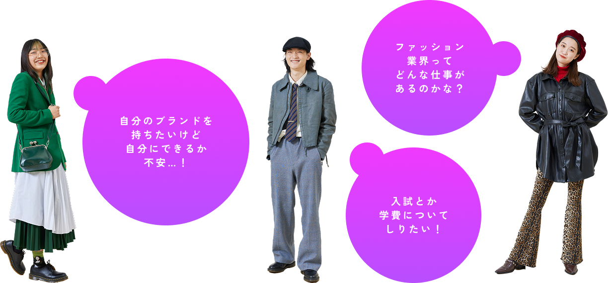 ファッションに興味がある方、将来ファッション業界で活躍したいと考えている方、自分のスタイルを追求して夢を叶えたいと思っている方。オープンキャンパスでは、学びの楽しさや充実したカリキュラムを体験できる絶好のチャンスです!ファッションの世界をもっと知りたいあなたをお待ちしています。